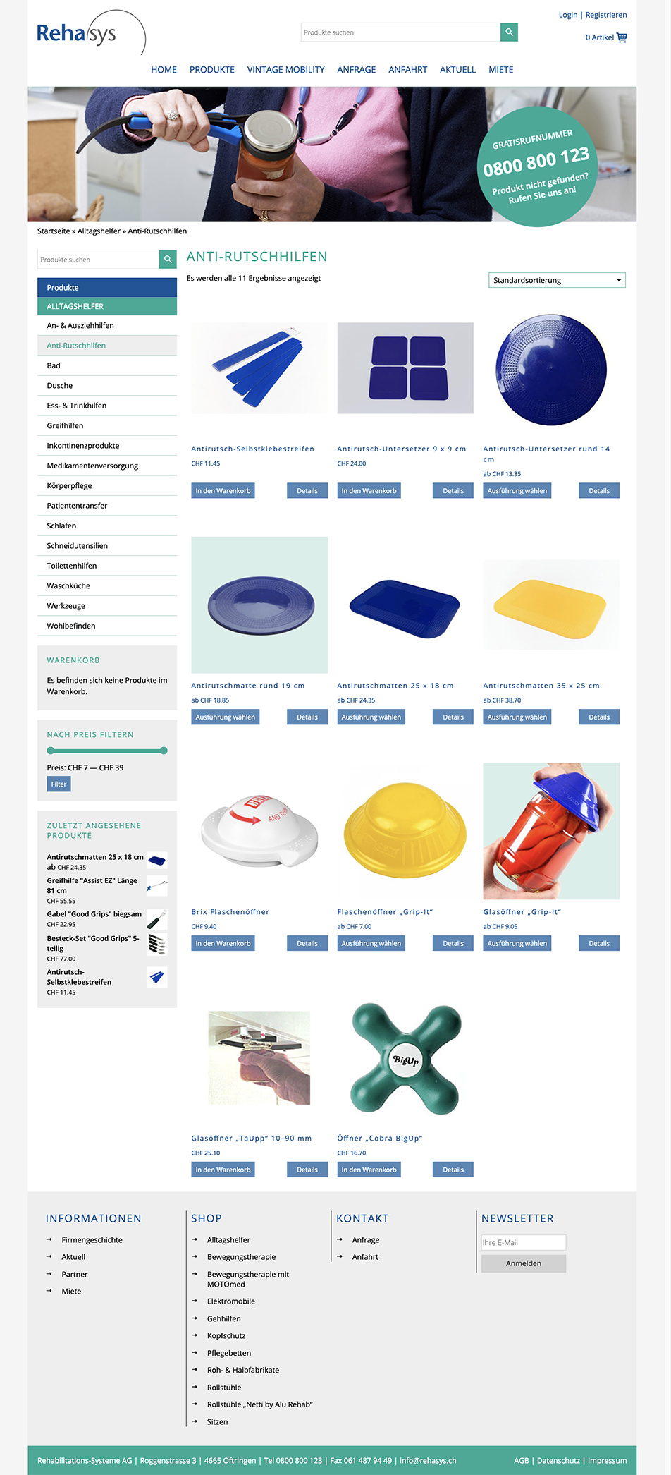 Die in Oftringen beheimatete Rehabilitations-Systeme AG existiert schon seit 1926. Nicht ganz so alt, aber veraltet und insbesondere nicht mobiltauglich präsentierte sich der Online-Shop. Mit dem neuen Webshop sollten verschiedene Anforderungen umgesetzt werden, die das Einkaufserlebnis verbessern und die Wünsche der Kunden erfüllen.