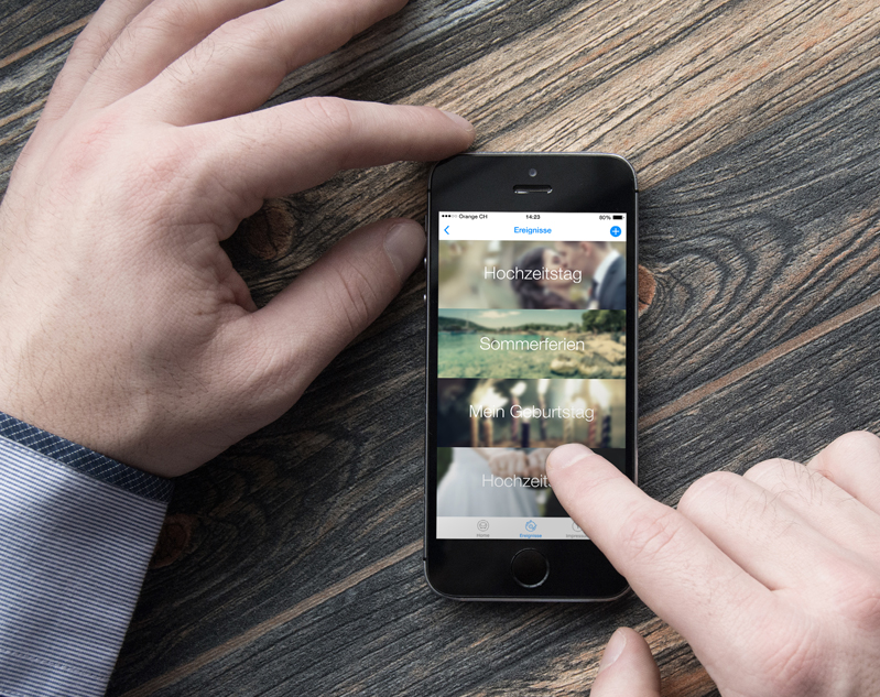 Mit vier Eingaben kann ein neues Ereignis eingegeben werden: Benötigt werden lediglich ein Titel, die Auswahl einer Kategorie, ein passendes Hintergrundbild (für jede Kategorie ist bereits ein Foto vorhanden, welches durch eine eigene Aufnahme ersetzt werden kann. Zu guter Letzt wird das Datum und die Uhrzeit fixiert und gespeichert.